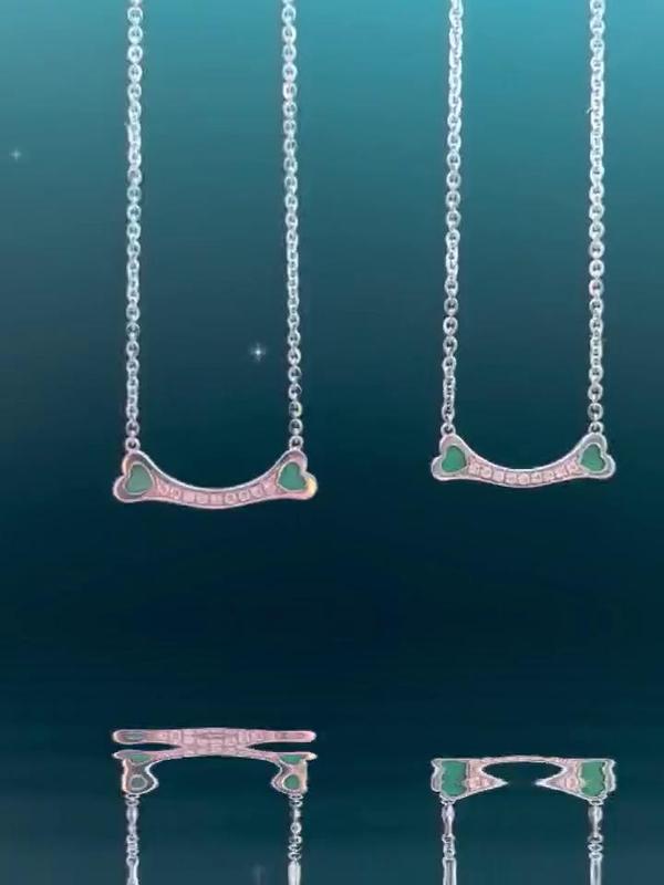 两心相悦-刻骨铭心,刻骨•铭心Bone • Heart Xin •Yue系列:我可能忘记回家的路,但永远忘不掉找你的路;我可能忘记所有的人,唯独对你的记忆刻骨铭心。这就是爱情,没有甜言蜜语,但是爱意满满。宇豪斯宾坚守设计风格的独特性,深刻阐述作品的内涵和特质,在设计构造中将元素主体的骨头造型镶嵌两粒心型宝石作为点缀——K金骨头造型寓意“情深至骨”,左右两粒心型宝石寓意“彼此同心,两心相悦”。整体造型呈现“舟”的曲线,在兼顾柔美的前提下也是爱有所承载的体现。这一系列从作者的角度阐述了对“爱”的独特理解和与众不同的创作思路。